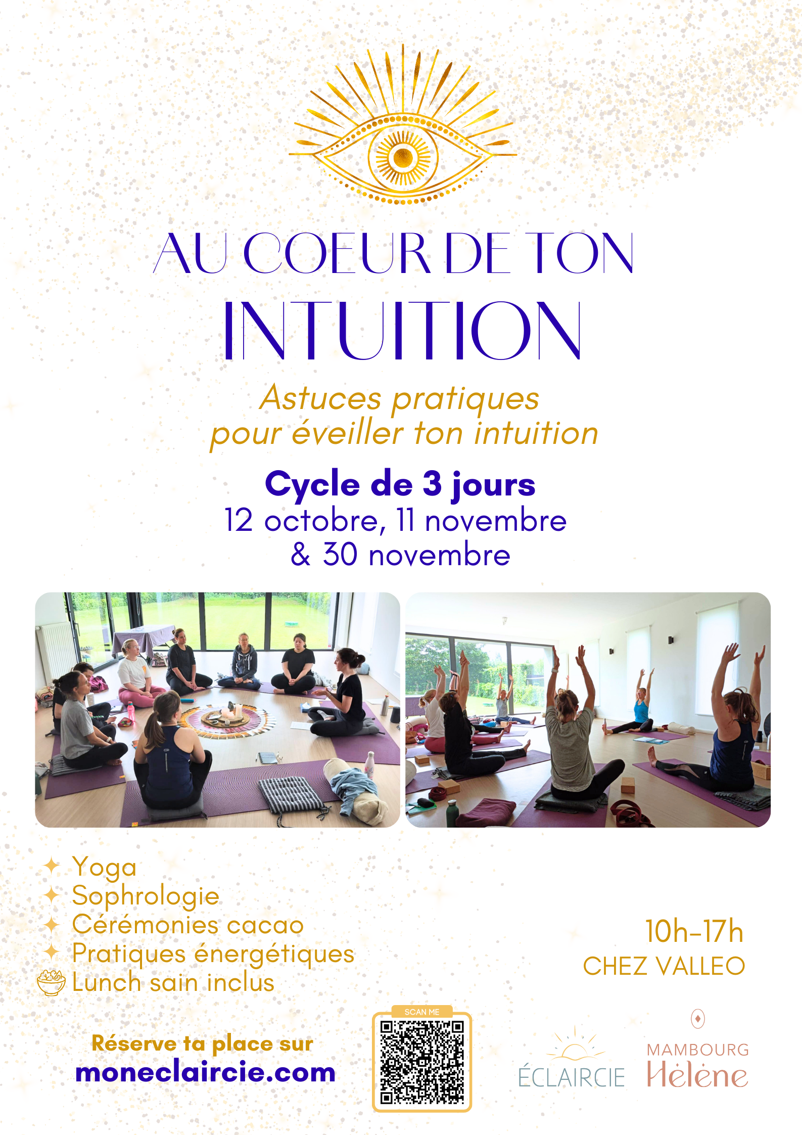 Avec Eloise, on a à coeur de t’accompagner dans cette reconnexion à toi-même, cette reconnexion à ton propre pouvoir. Et c’est pour cette raison qu’on a hâte de vivre ce cycle de trois jours avec toi, ces 12 octobre, 11 et 30 novembre !